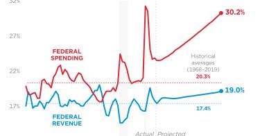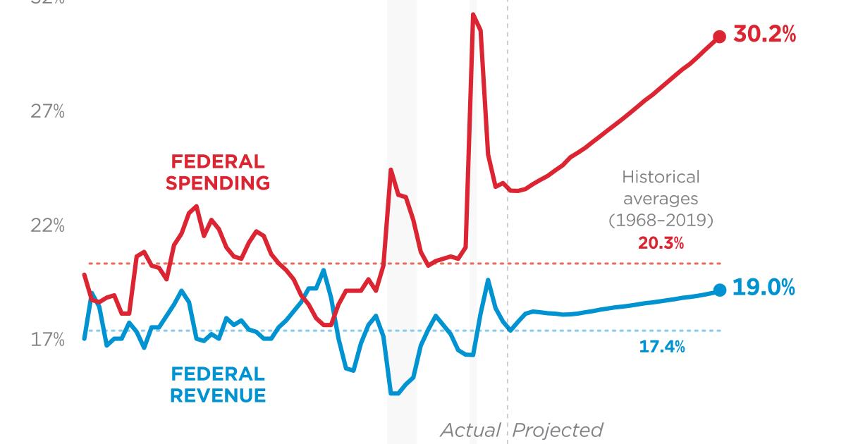 For more than 50 years prior to the COVID-19 pandemic, federal spending averaged a whisker over 20% of the economy. That temporarily spiked above 30% in 2020 and 2021 due to the immense (and extremely wasteful) spending spree by Congress.